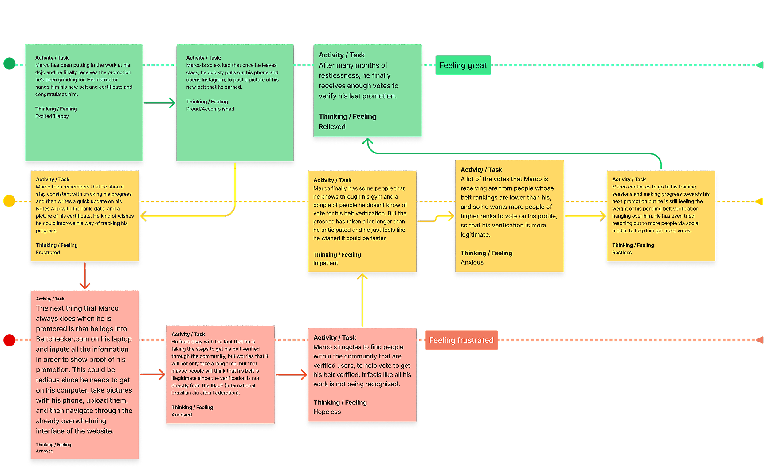 The journey map outlines how students move through the process of earning and verifying their belt promotions within the martial arts community. It highlights the key steps from training and preparation, to receiving promotion, to having that achievement recognized and validated by their peers and instructors. This helped show where students feel motivated where they face uncertainty and how DOJO+ can support a smoother and more trusted promotion experience.